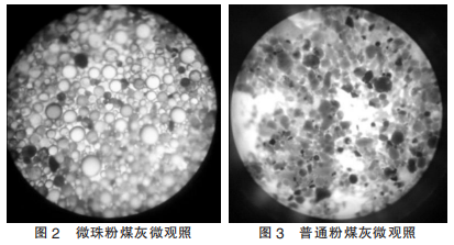 采用普通光學顯微鏡放大100倍進行觀查,可以看到微珠粉煤灰顆粒呈現完美正球形,顆粒級配連續,相互填充,從顏色和形態分辨,不規則碳粒占比較少;而普通灰顆粒有球形存在,但不規則,不規則顆粒較多。事實上目前市場上部分粉煤灰采用粉磨工藝制備而非收集原灰,這一類粉煤灰球形顆粒被破壞,失去了粉煤灰的滾珠效應,但現行規范對此沒有界定。